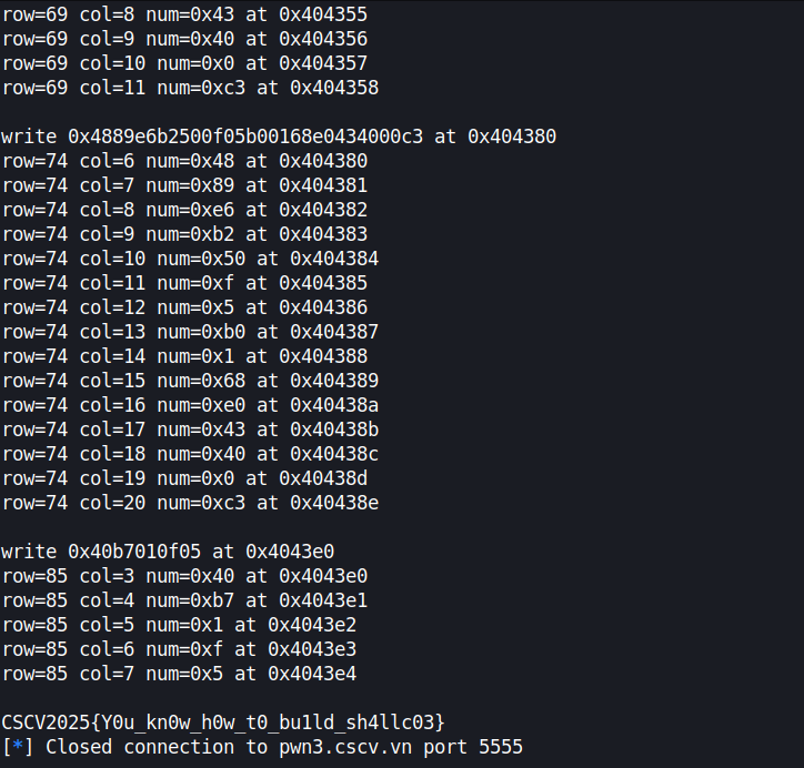 Do các đầu vào là row, col, num không được kiểm tra kỹ càng, chúng ta có thể thực hiện OOB write ra ngoài BOARD. Đây là vùng RWX nên chúng ta sẽ ghi shellcode tại đây.