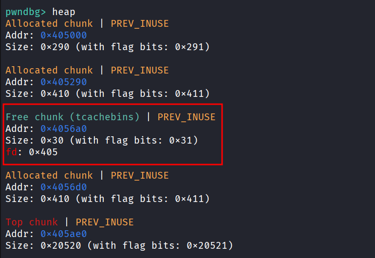 Để ghi đè thành pico, ta sẽ free chunk này để đưa vào tcache, sau đó ta allocate lại đúng kích thước và ghi đè.