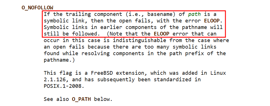 Basically, if the symlink is created at /var/lock/apport/lock, the open will fail, because that’s the basename of the path. But if the symlink is created at earlier components like /var, /var/lock, or /var/lock/apport, open will still follow the link.