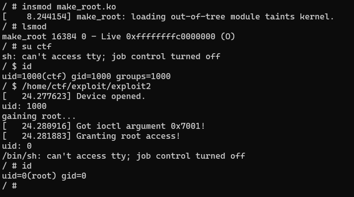 This is my first time setting up QEMU, debugging kernel with GDB, and exploiting kernel modules for privilege escalation and seccomp bypass.