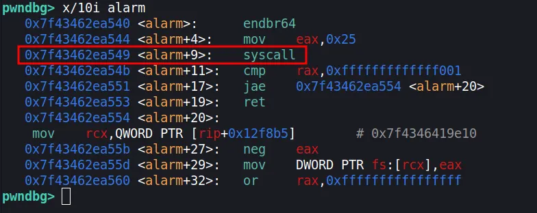 Ta có thể trích xuất gadget syscall này bằng cách ghi đè byte cuối của GOT entry của alarm thành 0x49.