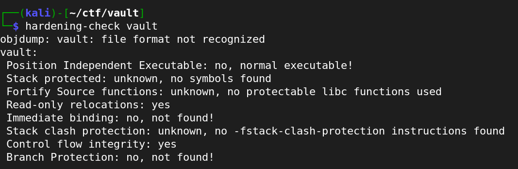 Lần đầu tiên mình gặp bài không checksec được, nên cũng loay hoay mãi =)) Ở đây mình dùng hardening-check, thấy là PIE disable, không có canary, Full RELRO,…