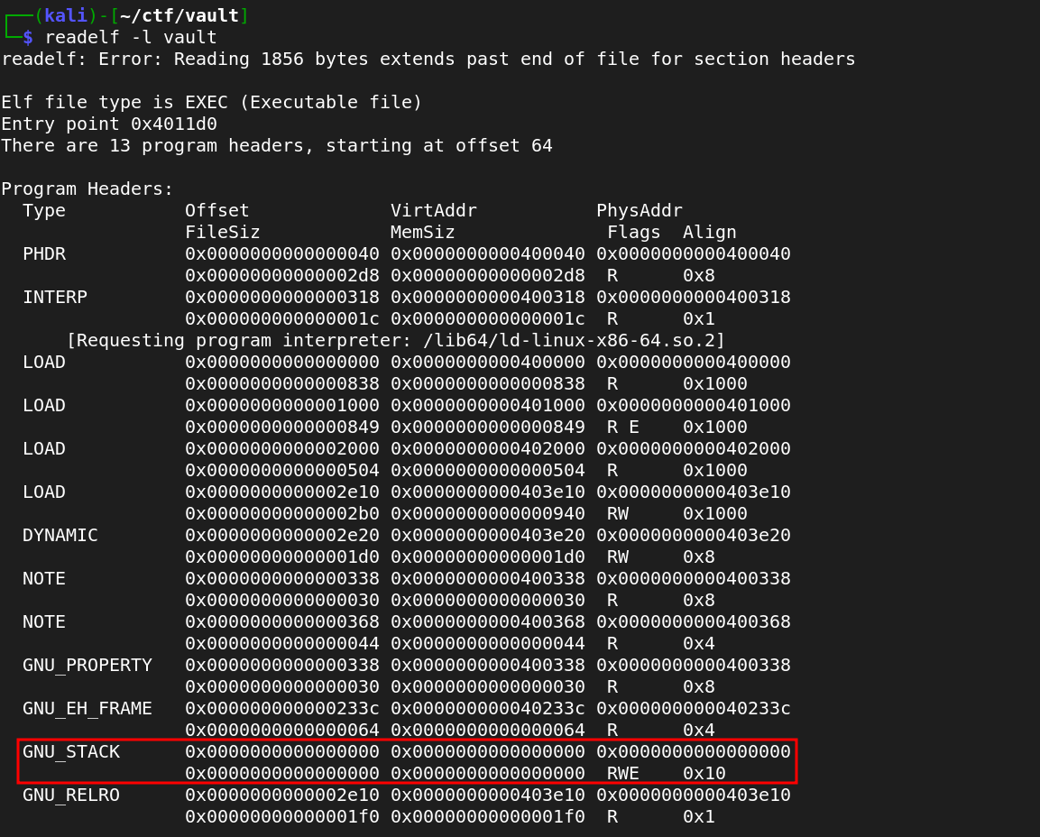 Sử dụng readelf -l còn thấy stack là vùng RWE.