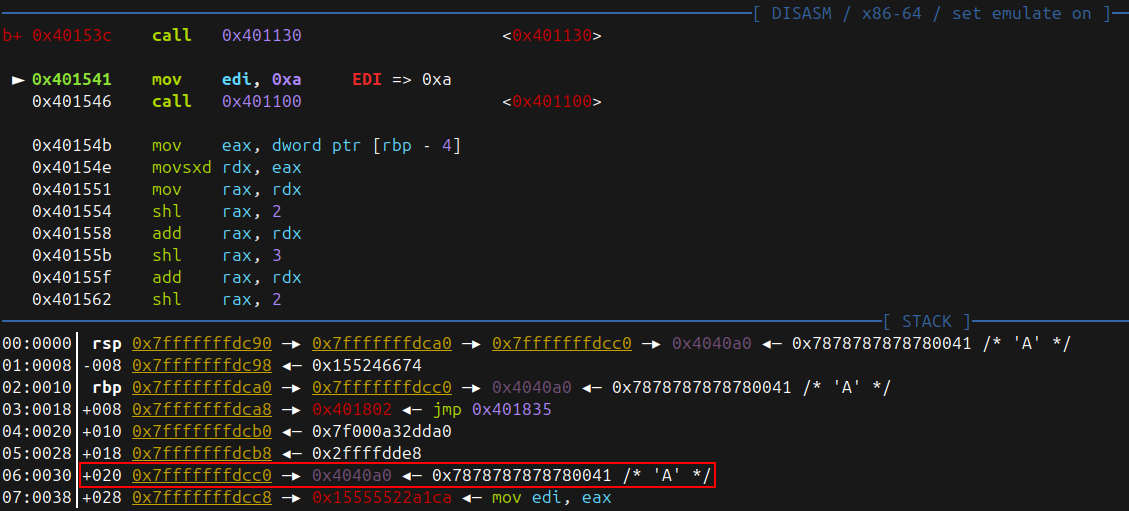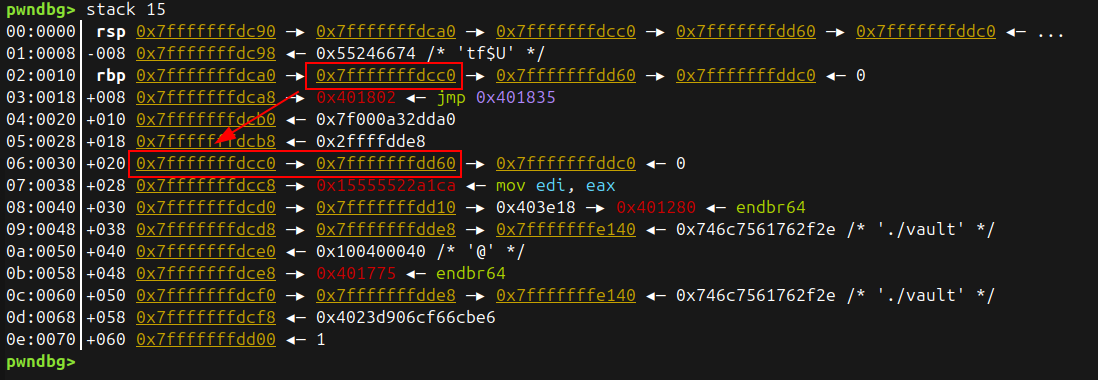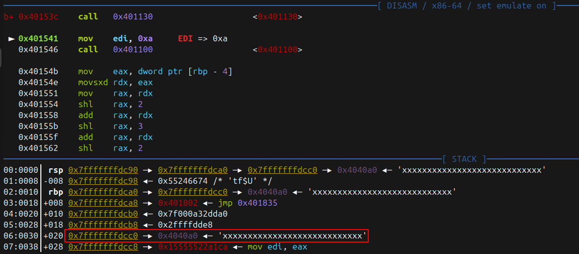 0x7fffffffdcc0đã ở trên stack, FSB để ghi địa chỉ củapasswordvàorbptrước đó (Tại0x7fffffffdcc0như trong ảnh trên).