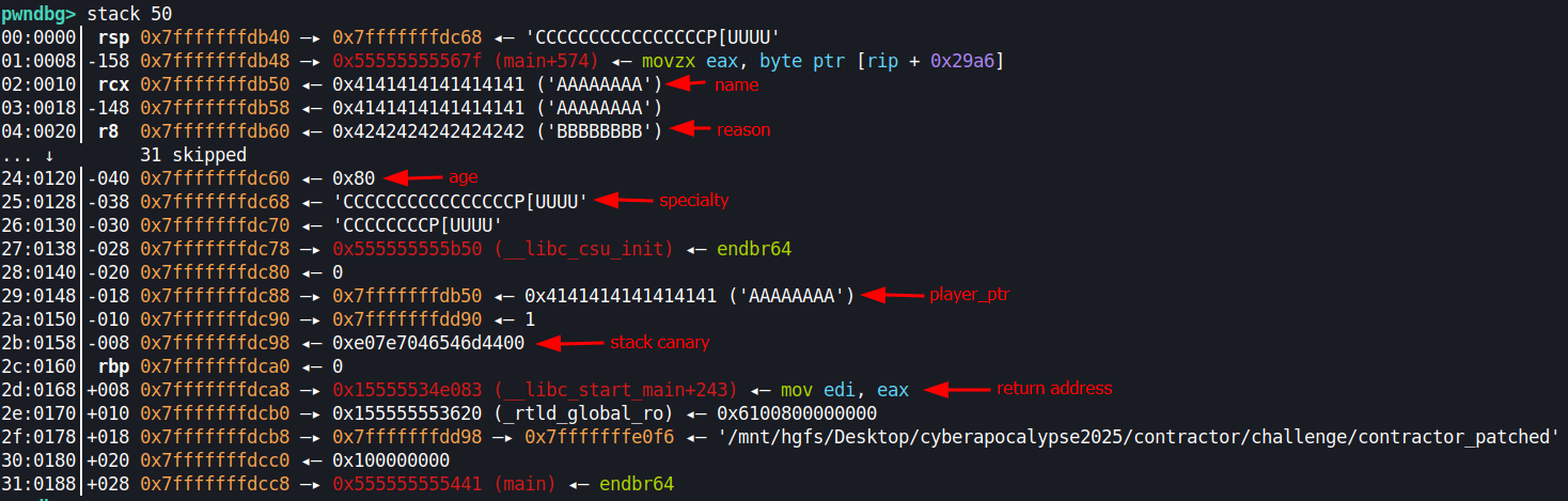 player_ptr->specialty);Chúng ta có thể nhập 16 bytes vào specialty, và bởi vì không có null terminator, địa chỉ của __libc_csu_init cũng được in ra, từ đó leak được địa chỉ base của binary.