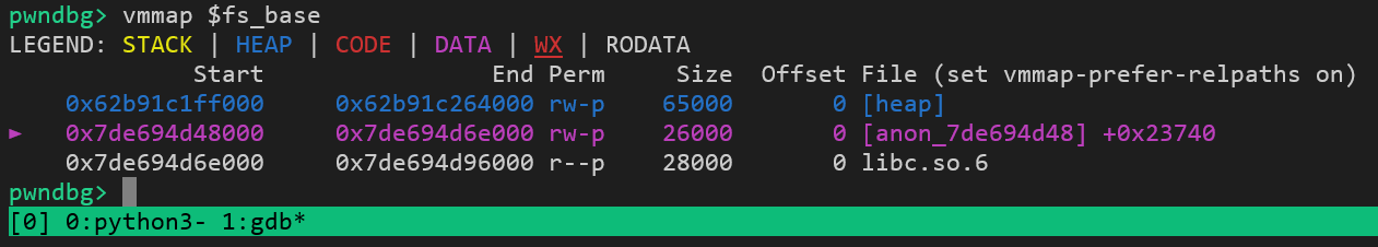 Vùng bộ nhớ này không chỉ chứa dữ liệu heap mà còn bao gồm cả TLS (thread-local storage), điều này có thể xác nhận thông qua con trỏ fs.