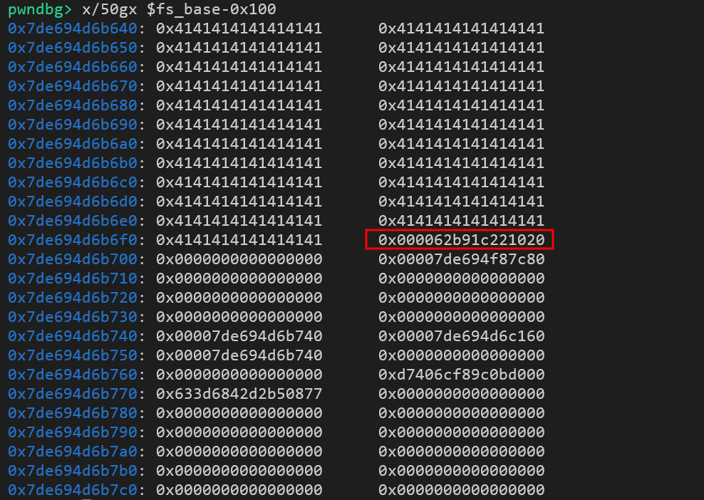 # Tcache pointer nằm ở fs_base - 0x48 (có thể khác tùy môi trường)