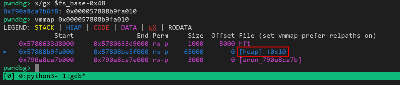 Chúng ta có thể xác định offset của con trỏ này tại offset -0x48 trong TLS, nó trỏ tới tcache_perthread_struct ở offset 0x10 trên heap.