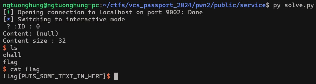 ngtuonghung@ngtuonghung-pc:~/ctfs/vcs_passport_2024/pwn2/public$ ./run.shngtuonghung@ngtuonghung-pc:~/ctfs/vcs_passport_2024/pwn2/public$ nc 0 9002