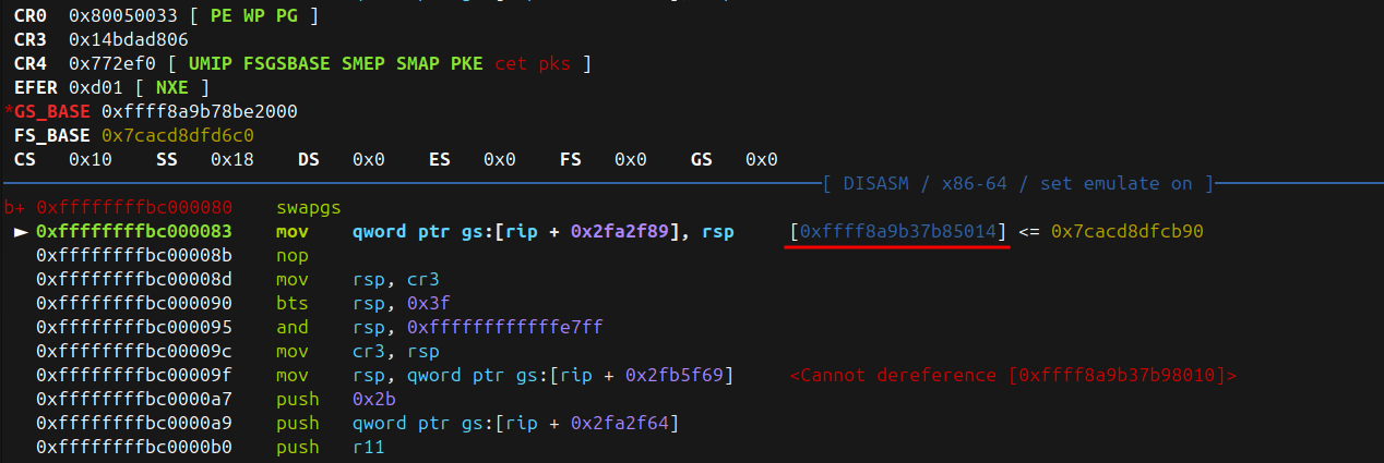 $5 = 0xffff8a9b37b85014Mình biết RIP, biết relative offset, nhưng ko thế nào có được GS_BASE của kernel sau khi swapgs. GS_BASE của userspace thì toàn là 0x0. Tất nhiên mình ko có quyền để đọc GS_BASE của kernel rồi.