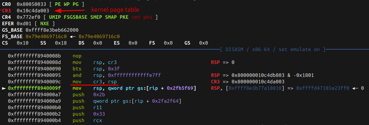 Dựa vào đâu để mình leak physmap base? Trước khi đổi sang page table của kernel, hàm còn dùng đến một địa chỉ nằm ở physmap để lưu RSP hiện tại của userspace, mình sẽ dựa vào đây để leak physmap vì nó cũng đc cache vào TLB.