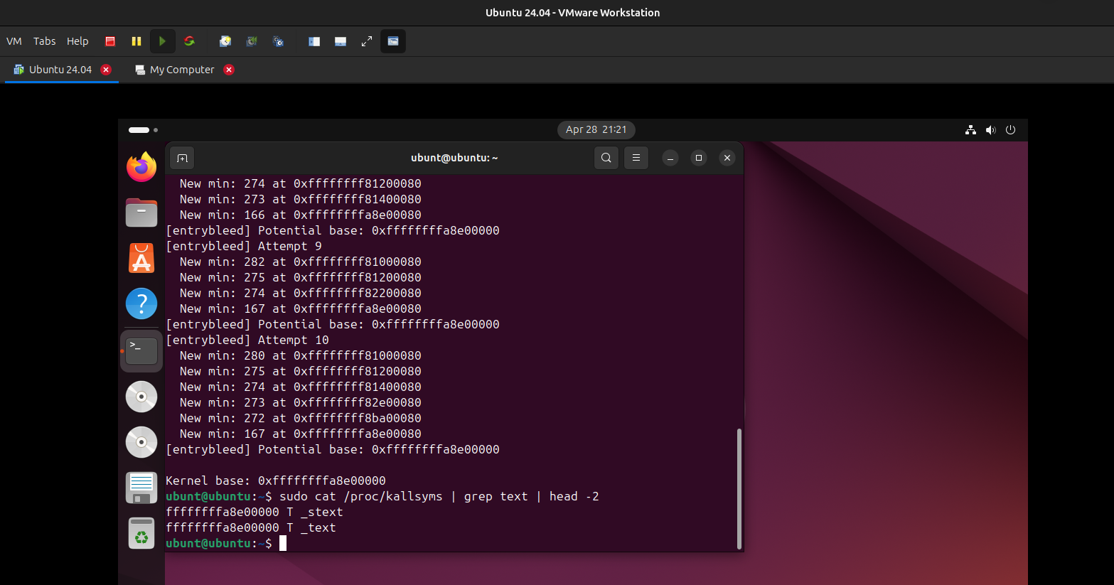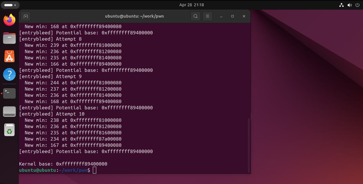 CVE-2022-4543 > Experimenting with EntryBleed - A Universal KASLR Bypass against KPTI on Linux