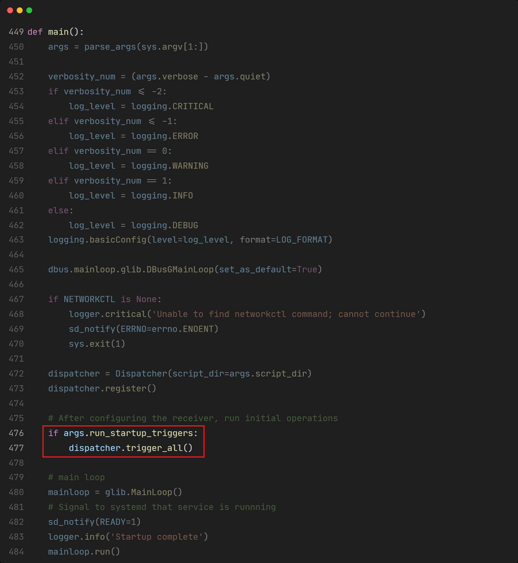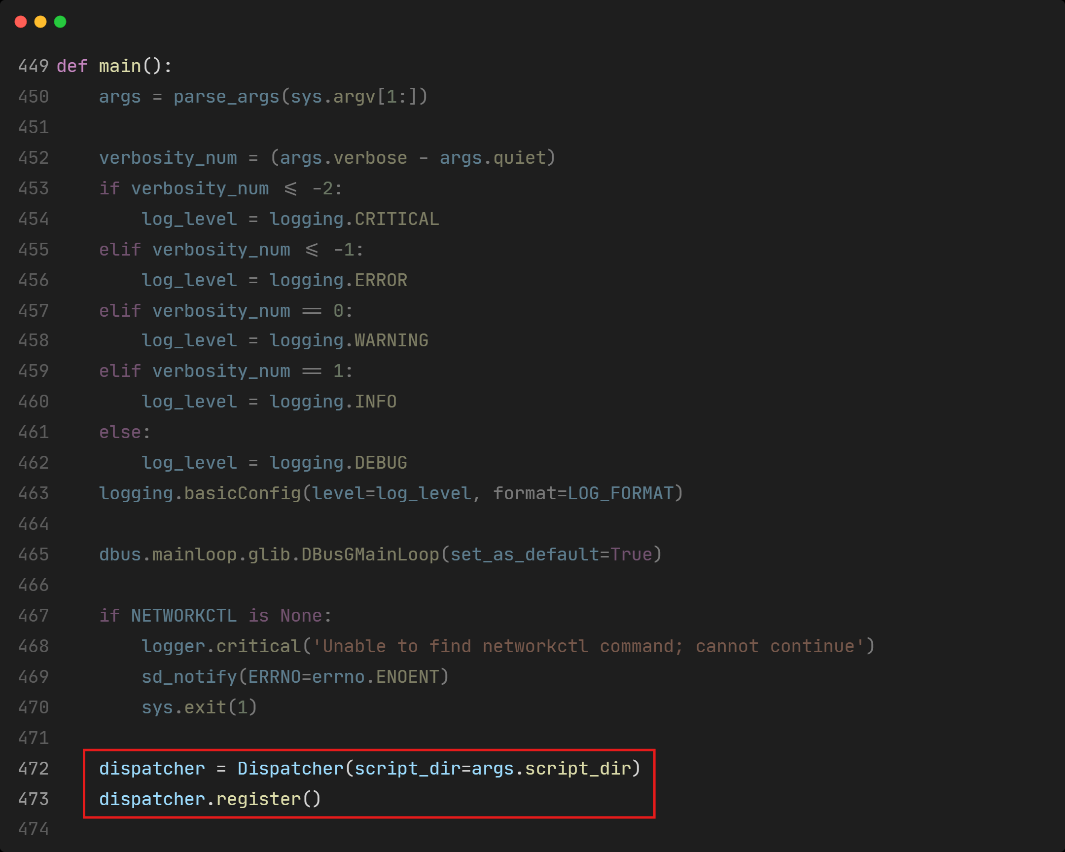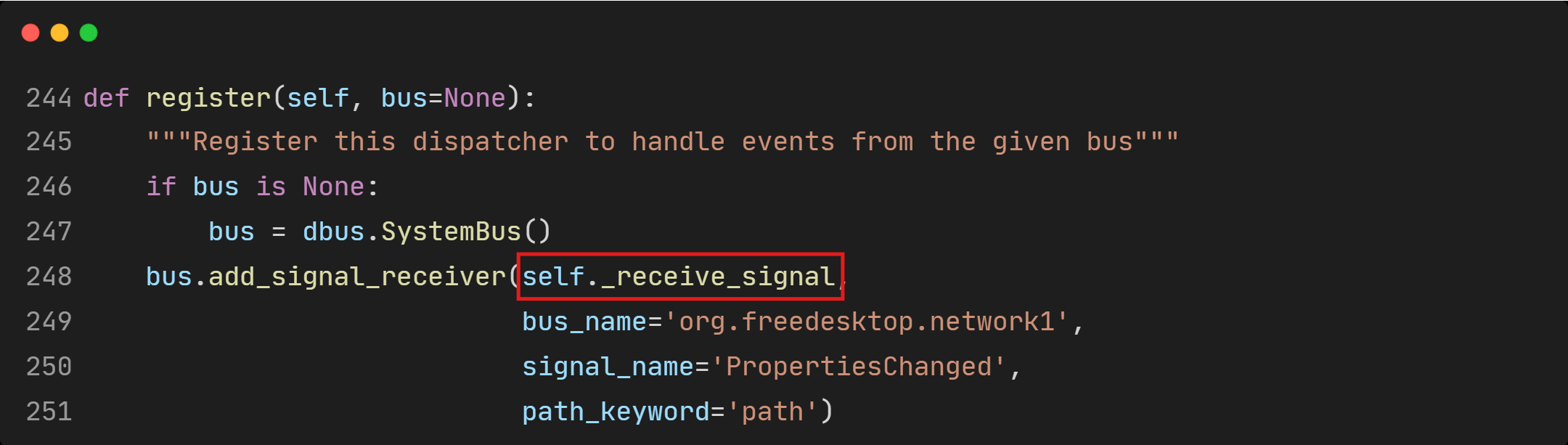 For better understanding of _receive_signal(), we take a look at register(), where _receive_signal() is registered as a callback handler for D-Bus PropertiesChanged signals coming from org.freedesktop.network1. And this registration happens at the start of the program.