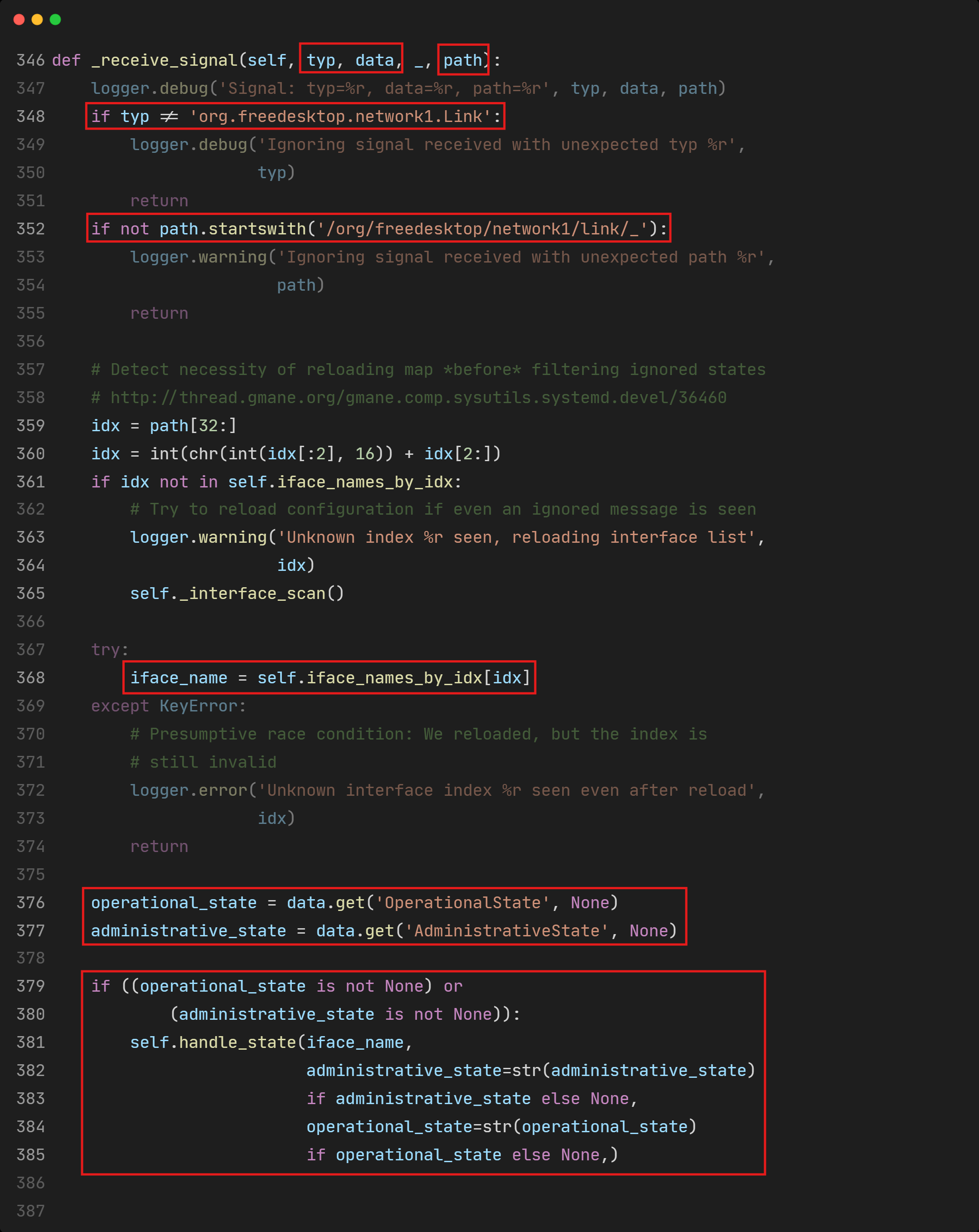 So, _receive_signal() is called whenever there’s a PropertiesChanged signal from systemd-networkd. And in order for handle_state() to be executed, there are some conditions that need to be met: