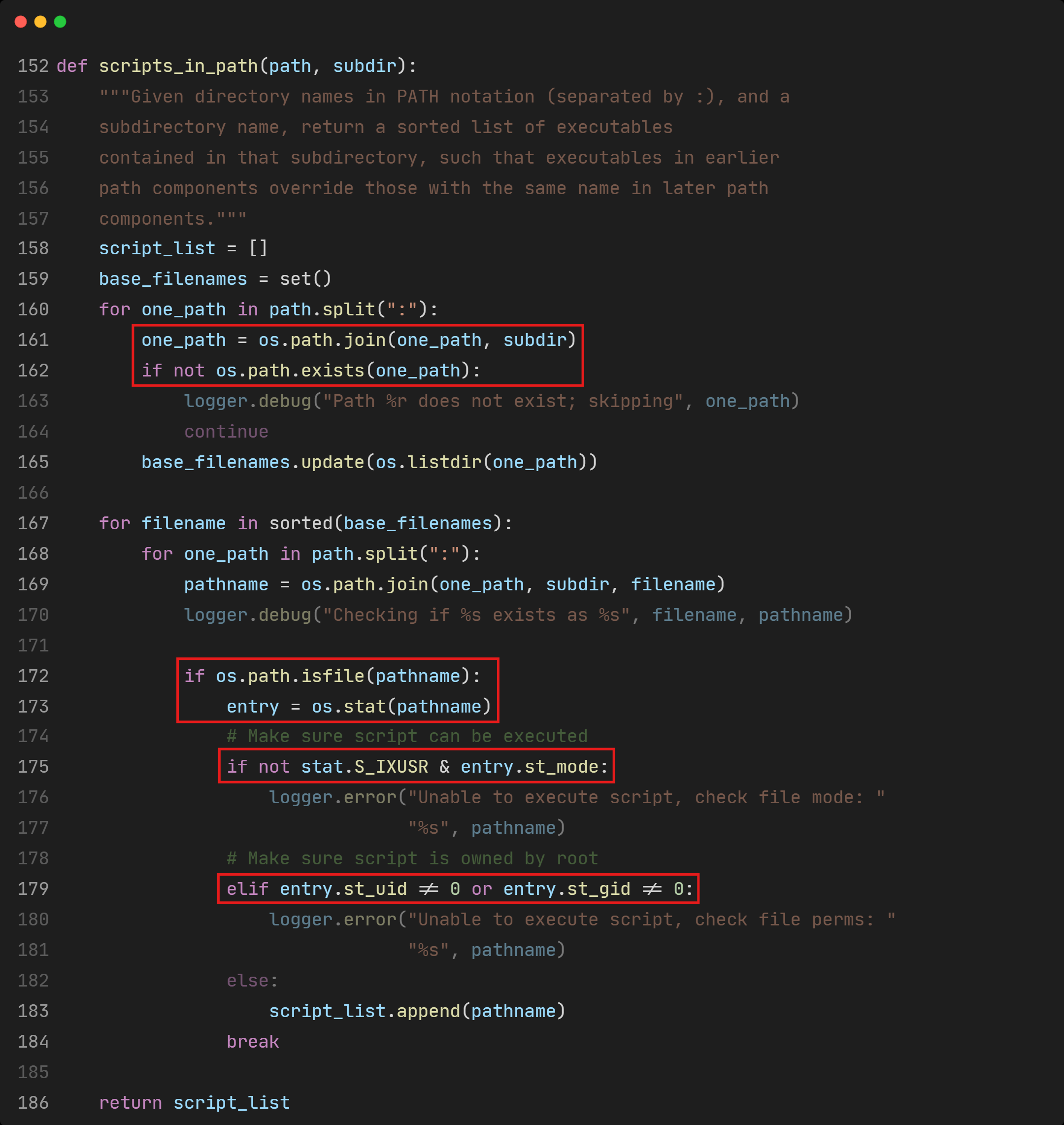Inside scripts_in_path(), first it gathers all the scripts’ filenames into the base_filenames set, then, for each filename in the set, it checks if the script still exists, is owned by root and can be executed, finally appending the full path of the script to script_list.