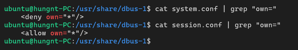 The rules are different between buses. On the system bus, strict policies limit name ownership - typically only root or specific system users can own important names like org.freedesktop.NetworkManager. On the session bus, the current user’s applications can generally own names freely since it’s less security-critical.