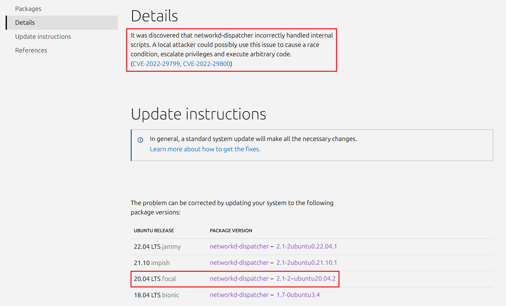 Here I’m targeting the vulnerable version on Ubuntu 20.04 LTS. Therefore, the vulnerable version should be older than 2.1-2~ubuntu20.04.2. Next, I looked at the publishing history of the networkd-dispatcher package here: Publishing history : networkd-dispatcher package : Ubuntu