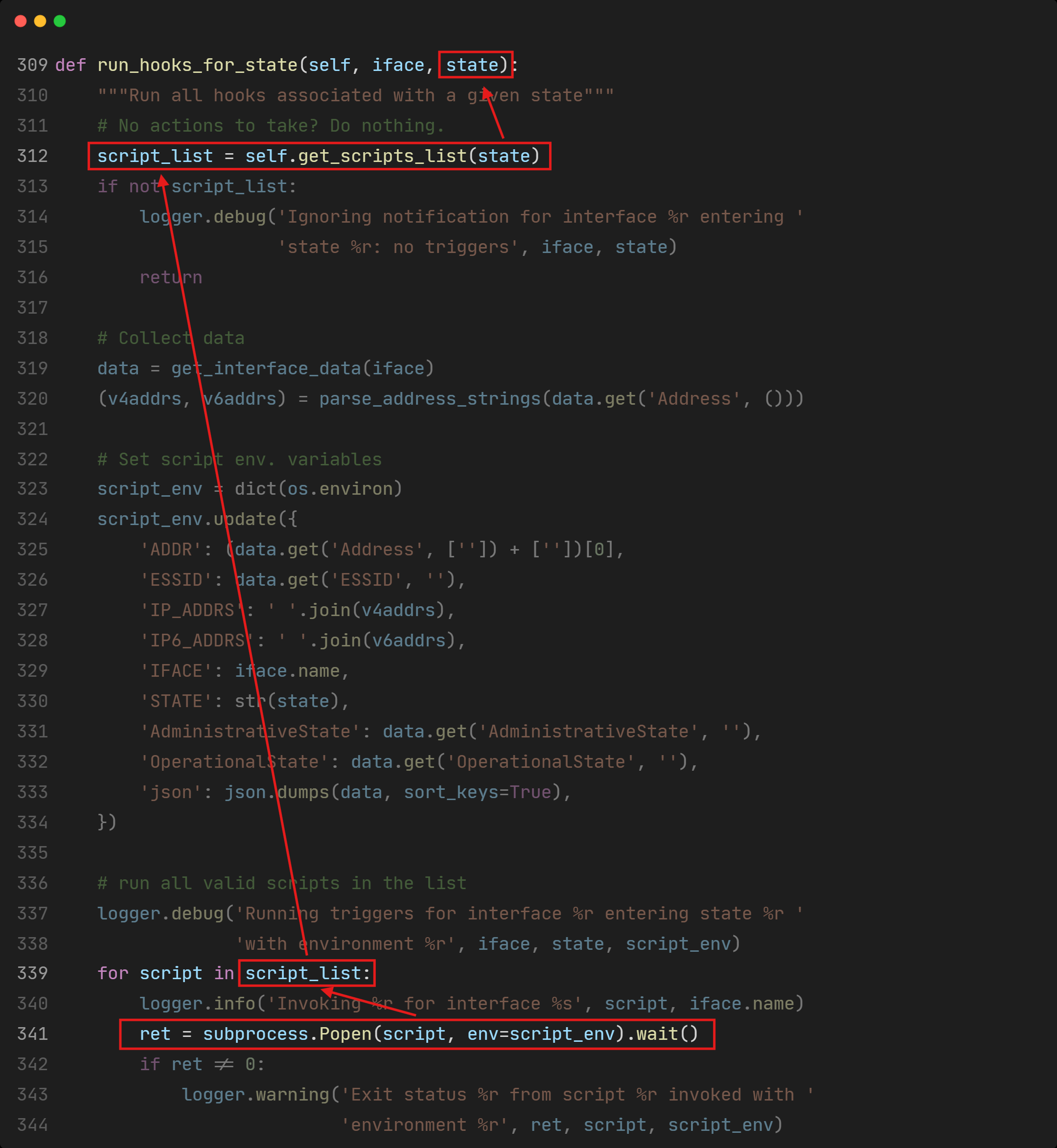 ./networkd-dispatcher:341: ret = subprocess.Popen(script, env=script_env).wait()There’s a call for subprocess.Popen() at line 341 in the networkd-dispatcher’s source code. Let’s check it out.