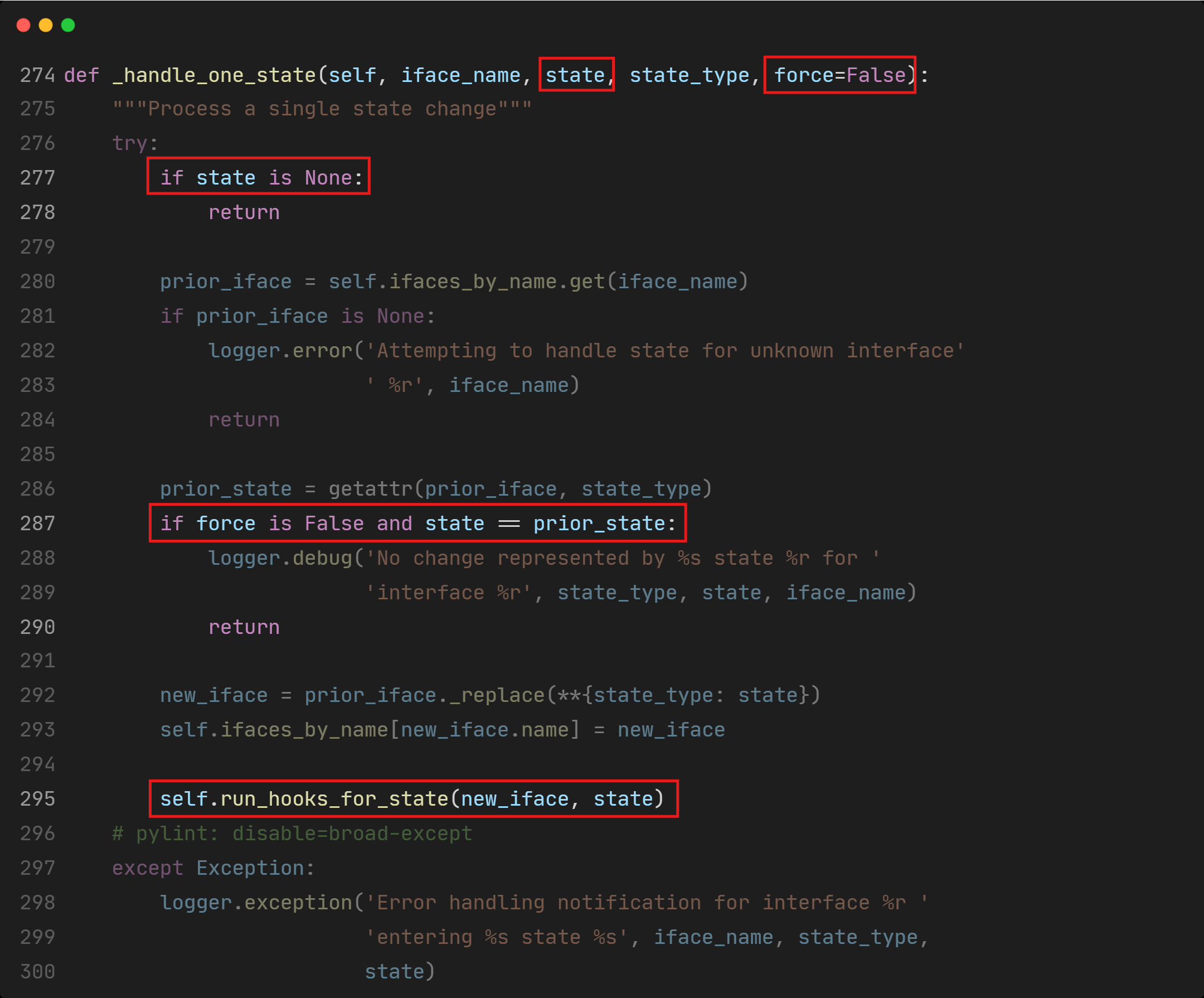 Now, let’s continue tracing back to where run_hooks_for_state() is called to see how the state argument is processed so that we might be able to figure out how to control it. There’s only one call in the _handle_one_state() function. run_hooks_for_state() is called when state is not None, and force is True or state has changed (different from the prior_state).