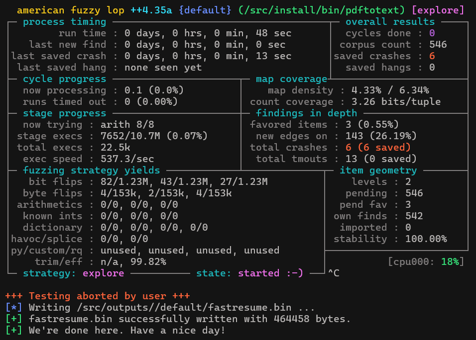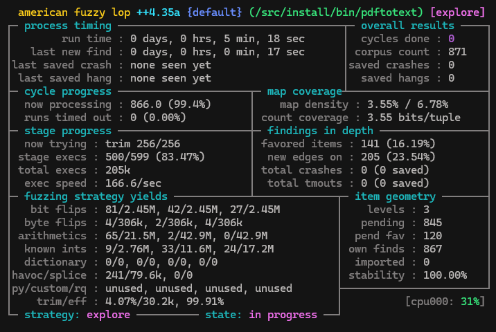 Sau khi patch xong mã nguồn. Mình build lại với instruments của AFL++. Và kết quả sau hơn 5 phút fuzz, không phát hiện crash nào.