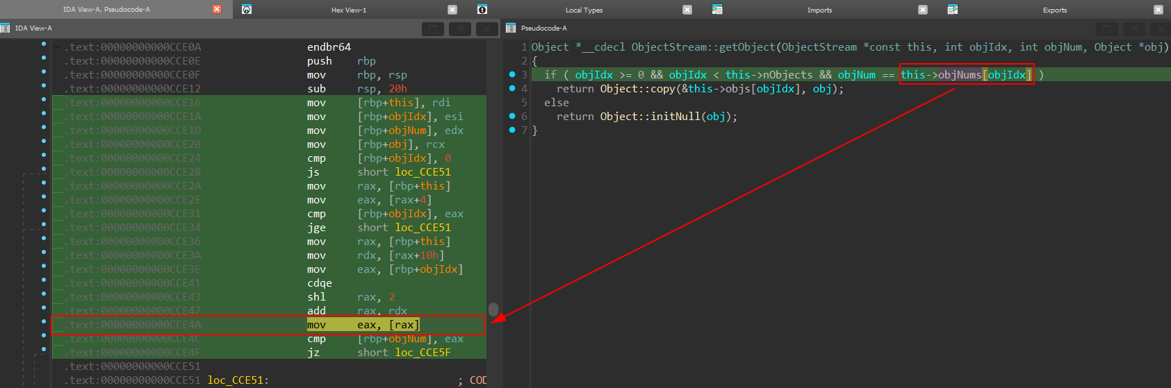 mov rax, [rbp+this]: Gán địa chỉ củathis(mộtObjectStream) vàorax.mov rdx, [rax+10h]: Gán địa chỉ củaobjNumsvàordx.mov eax, [rbp+objIdx]: Gán giá trị củaobjIdxvàoeax.cdqe: Extend giá trị 32bit củaeaxvàorax64bit.shl rax, 2: NhânobjIdxvới 4 (do là int).add rax, rdx: Gán địa chỉobjNums + objIdxvàorax.mov eax, [rax]: Lấy giá trị tại địa chỉobjNums + objIdxđặt vàoeax.