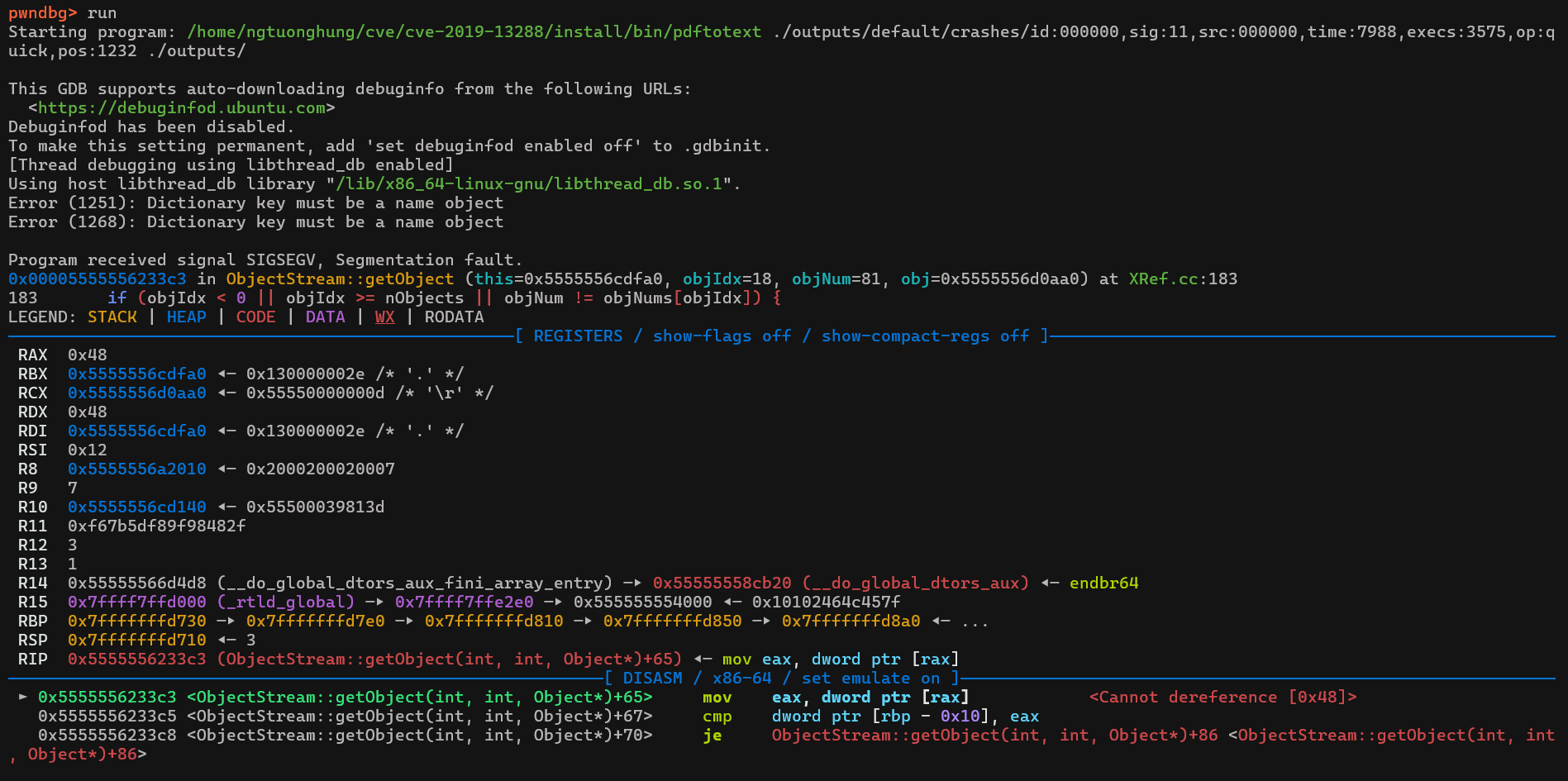 ngtuonghung@ngtuonghung-pc:~/cve/cve-2019-13288$ gdb --args ./install/bin/pdftotext "./outputs/default/crashes/id:000000,sig:11,src:000000,time:7988,execs:3575,op:quick,pos:1232" ./outputs/Chương trình crash khi đang cố gắng truy cập bộ nhớ tại địa chỉ 0x48 (không hợp lệ):