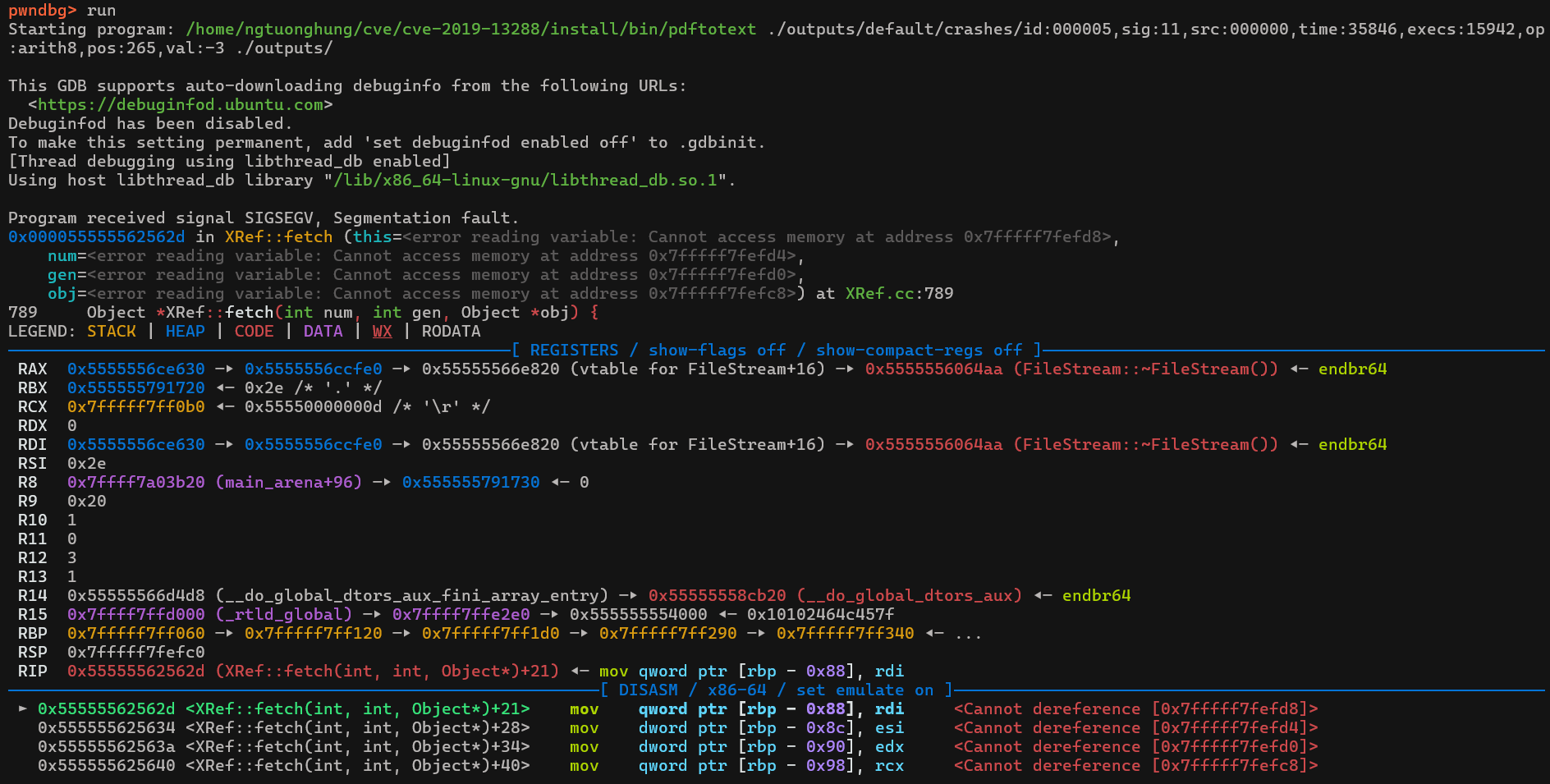ngtuonghung@ngtuonghung-pc:~/cve/cve-2019-13288$ gdb --args ./install/bin/pdftotext "./outputs/default/crashes/id:000005,sig:11,src:000000,time:35846,execs:15942,op:arith8,pos:265,val:-3" ./outputs/Chương trình đang cố gắng truy cập một địa chỉ nhìn có vẻ như địa chỉ stack: