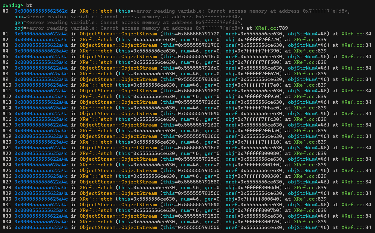 Chạy backtrace một lúc mình có được nơi bắt đầu của đệ quy đó là hàm XRef::fetch tại XRef.cc:84: