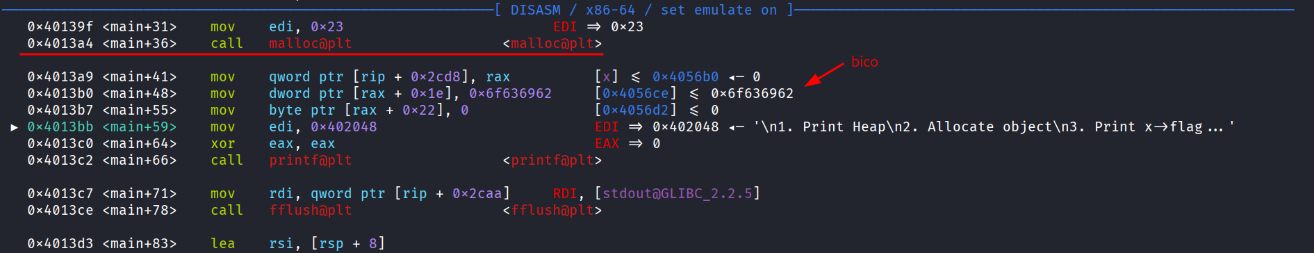 Mục tiêu chính là ghi đè bico trở thành pico để lấy được flag. Vậy nhìn vào vị trí trên heap, khoảng cách của chúng là 32 bytes: