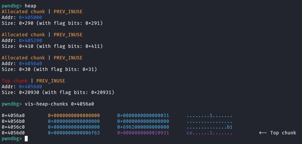Chunk được tạo ra có địa chỉ là 0x4056a0 và có size là 0x30 = 48 byte. Và theo như trong code bico được ghi vào mảng char là flag, cách vị trí bắt đầu 30 byte.