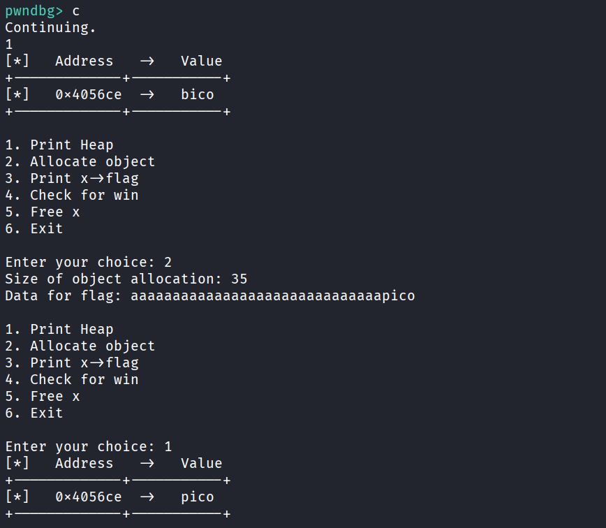 printf("\n1. Print Heap\n2. Allocate object\n3. Print x->flag\n4. Check for win\n5. Free x\n6. "
