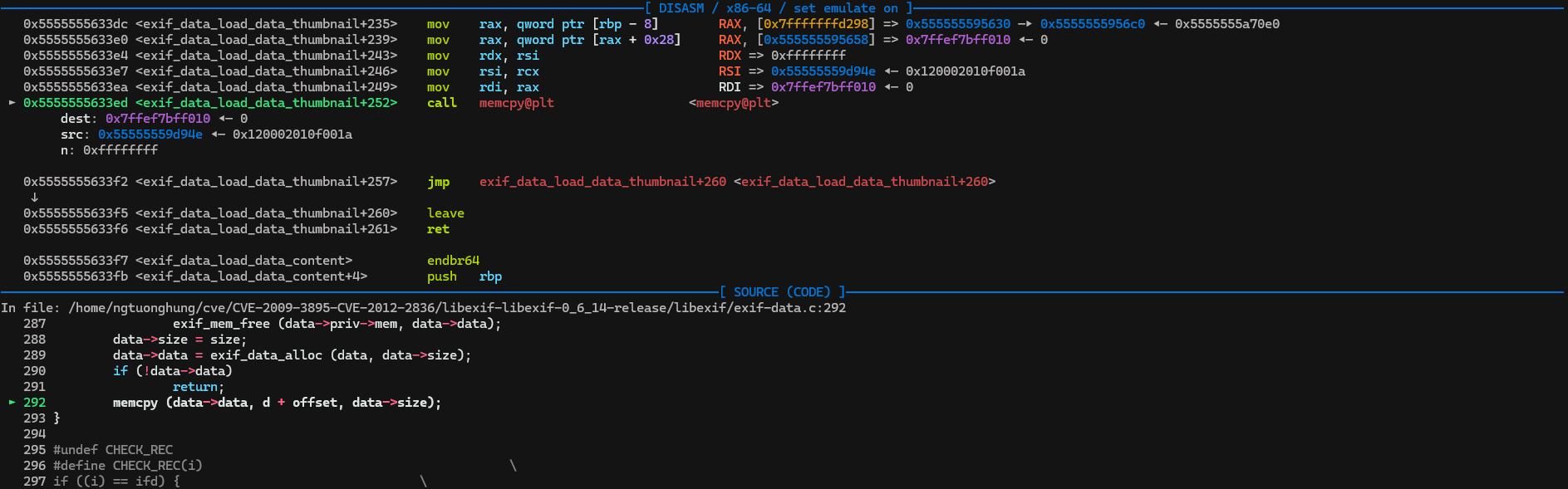 gdb.casrep: NOT_EXPLOITABLE: SourceAv: /home/ngtuonghung/cve/CVE-2009-3895-CVE-2012-2836/libexif-libexif-0_6_14-release/libexif/exif-data.c:292