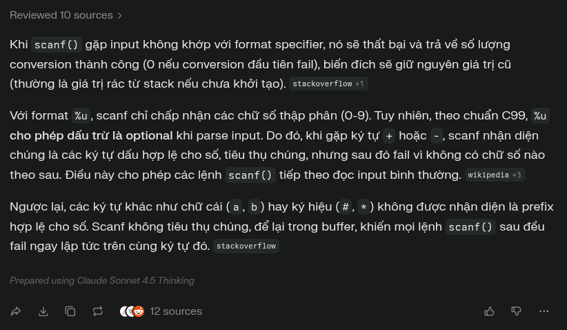 Thảo nào lúc mình thử nhập chữ cái vào thì nó ra một loạt như này luôn, là vì scanf() ko consume ký tự trong buffer stdin, dẫn đến mọi scanf() đằng sau đều lỗi luôn, ko nhập đc gì hết: