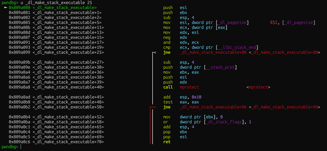 Hàm _dl_make_stack_executable() là một hàm setup các tham số và gọi đến mprotect() với điều kiện là ecx = dword ptr [eax] = giá trị của __libc_stack_end, và giá trị của __stack_prot = 7.