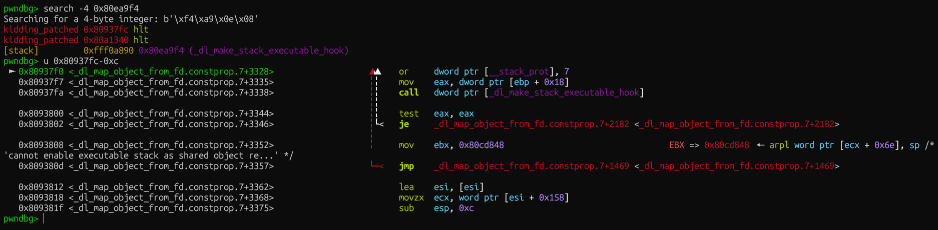 _dl_make_stack_executable_hook đc gọi tại _dl_map_object_from_fd.constprop.7+3338. Và trước đó __stack_prot được set về 7, và eax được gán giá trị tại [ebp + 0x18].