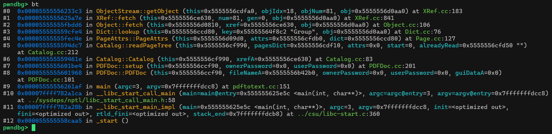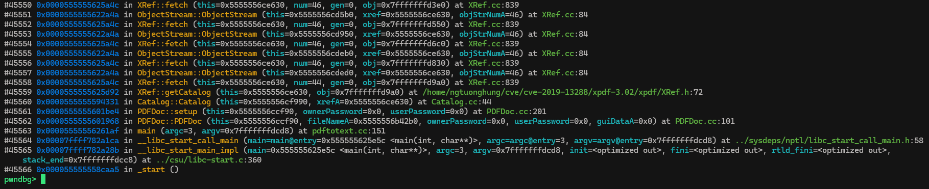 Chạy backtrace một lúc mình có được nơi bắt đầu của đệ quy đó là hàm XRef::fetch tại XRef.cc:84: